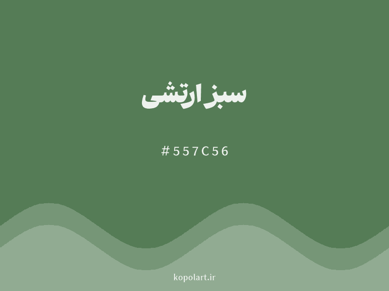 رنگ سبز ارتشی با کد هگزادسیمال 557C56، یک سبز-خاکستری تیره و آرام است. این رنگ از ترکیب سبز با مقداری خاکستری و کمی زرد به دست می‌آید و یادآور لباس‌های نظامی و طبیعت است. این رنگ نماد استقامت، آرامش و هماهنگی است و حسی از سکون و تمرکز را القا می‌کند. در طراحی فضاهای کاری و برندهای مرتبط با محصولات پایدار و فضای باز بسیار مؤثر است. ترکیب آن با رنگ‌های چوبی (قهوه‌ای)، کرم و نارنجی سوخته فضایی دنج و طبیعی ایجاد می‌کند.