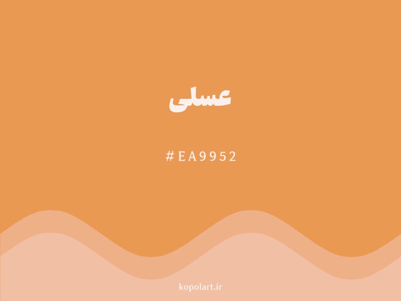 رنگ عسلی با کد هگزادسیمال ea9952، یک نارنجی-قهوهای روشن و گرم است. این رنگ از ترکیب نارنجی با مقداری زرد و قهوهای روشن به دست آمده و یادآور رنگ عسل طبیعی است. این رنگ حسی از گرما، شیرینی و صمیمیت را منتقل میکند و میتواند فضایی دلنشین و اشتهاآور ایجاد کند. در طراحی آشپزخانهها، کافهها و بستهبندی محصولات غذایی بسیار مناسب است. ترکیب آن با رنگ آبی سرمهای یا سبز تیره، کنتراستی شیک و جذاب ایجاد میکند.