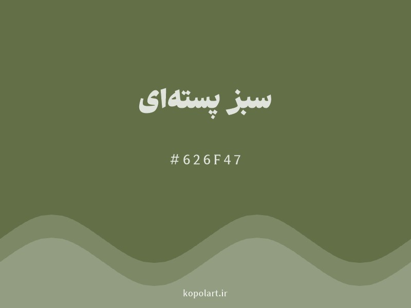 رنگ سبز پستهای با کد هگزادسیمال 626f47، یک سبز-زیتونی تیره و آرام است. این رنگ از ترکیب سبز و زرد با افزودن مقداری خاکستری و مشکی به دست آمده و یادآور رنگ برگهای زیتون است. این رنگ نماد طبیعت، صلح و استقامت است و حسی از پختگی و آرامش را منتقل میکند. این رنگ در دکوراسیون داخلی برای ایجاد فضایی دنج و شیک و در صنعت مد به عنوان رنگی کلاسیک بسیار محبوب است. این رنگ به زیبایی با رنگهای کرم، قهوهای و بنفش کمرنگ ترکیب میشود.