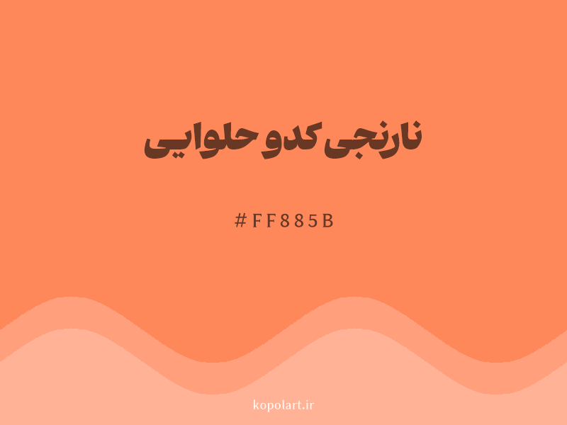 رنگ نارنجی کدو حلوایی با کد هگزادسیمال FF885B، یک نارنجی-صورتی روشن و شاداب است که به رنگ مرجانی شباهت دارد. این رنگ از ترکیب نارنجی و قرمز با افزودن مقداری سفید به دست آمده و حس انرژی، جوانی و دوستی را منتقل می‌کند. این رنگ در طراحی‌های پاییزی و تابستانی بسیار محبوب است. ترکیب آن با رنگ فیروزه‌ای روشن یا آبی آسمانی، تضادی زنده و بسیار دلنشین ایجاد می‌کند.
