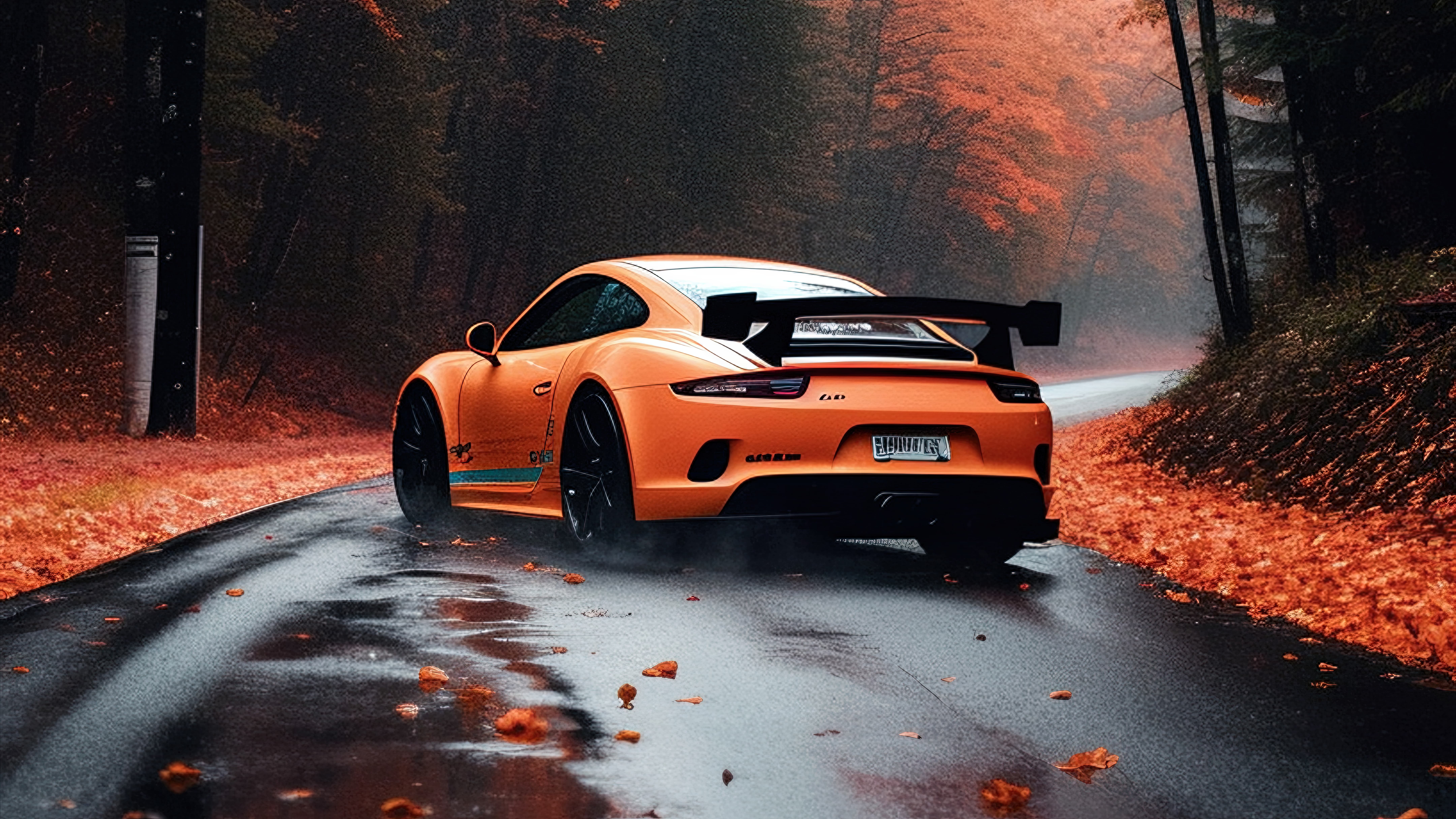 والپیپر پورشه 911 نارنجی با تم پاییزی با کیفیت FUHD (8k)